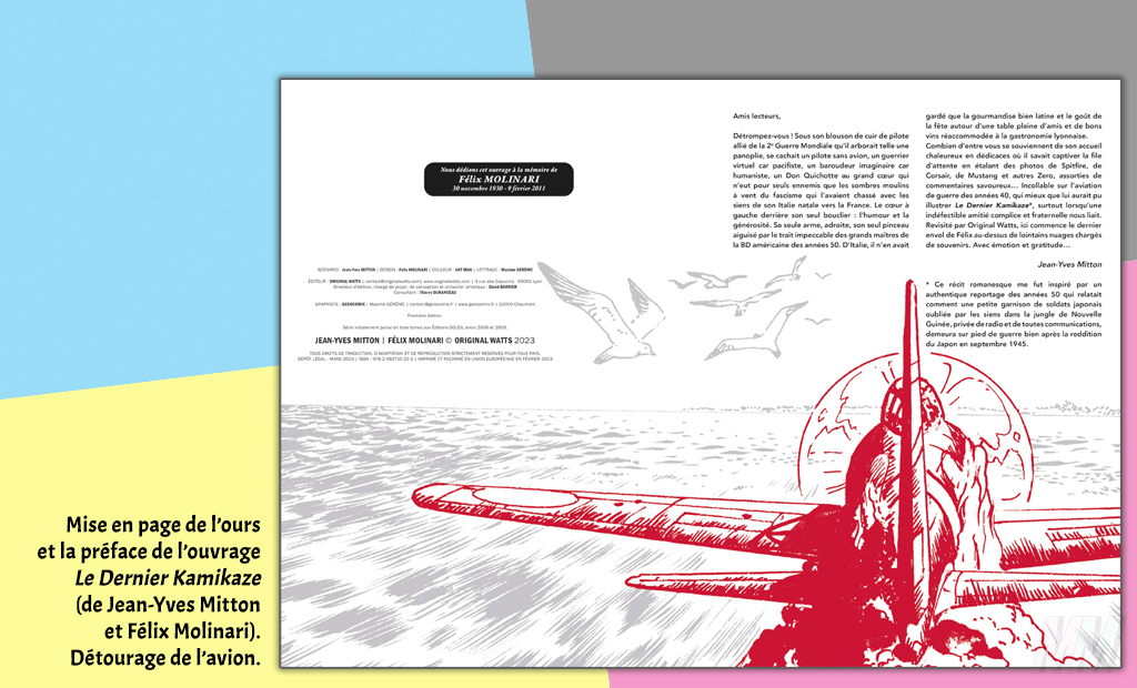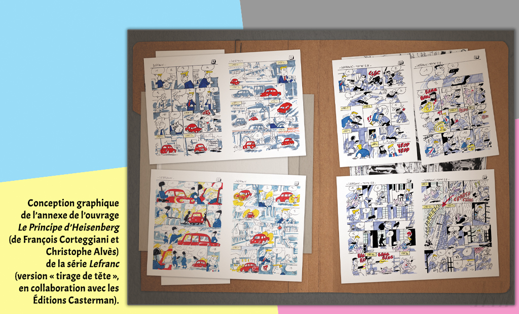 Mise en page des ouvrages (format BD traditionnel, comics, tirage de tête, portfolios, format à l'italienne, …) : vérification des fichiers fournis, création de gabarits, préparation des chemins de fer, nettoyage des planches si nécessaire, lettrage, création des éléments de couverture (vernis sélectif, dorure, …), création des fichiers pour impression…