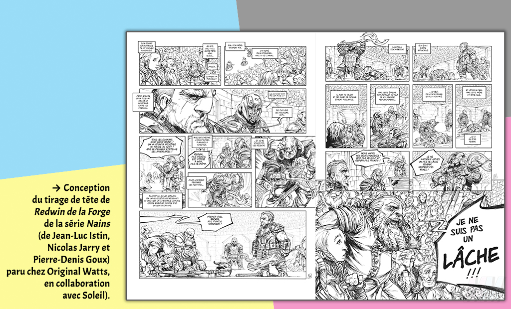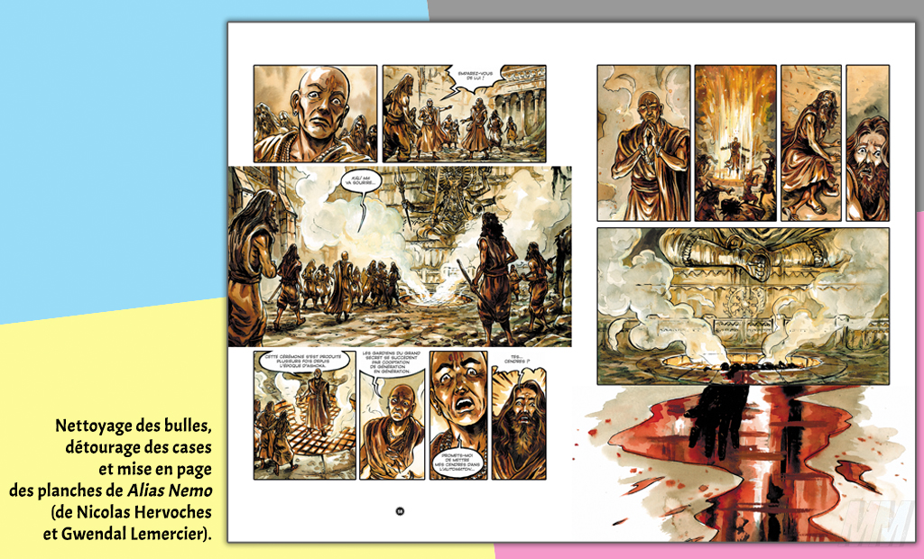 Mise en page des ouvrages (format BD traditionnel, comics, tirage de tête, portfolios, format à l'italienne, …) : vérification des fichiers fournis, création de gabarits, préparation des chemins de fer, nettoyage des planches si nécessaire, lettrage, création des éléments de couverture (vernis sélectif, dorure, …), création des fichiers pour impression…